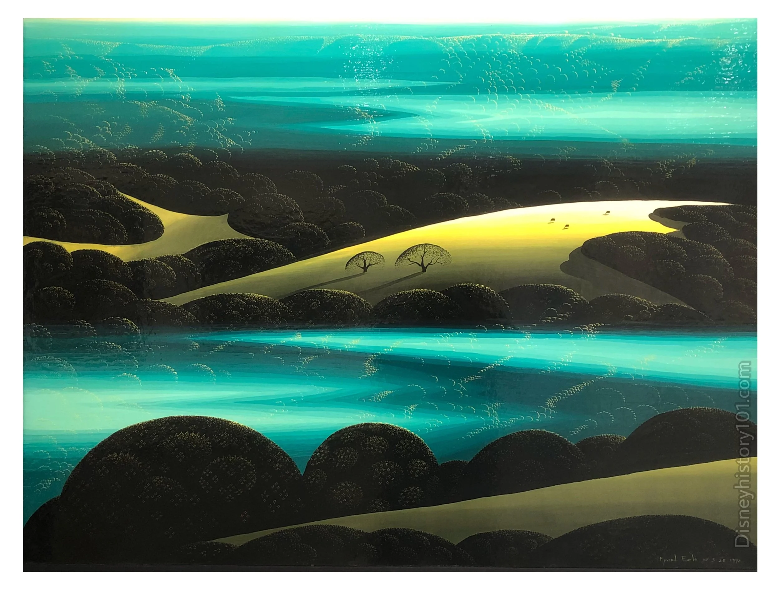 We'll always love Eyvind's contributions toward our favorite Walt Disney Productions films, in fact we'll have more of an appreciation for features thanks to his colorful, textural styling. However, our favorite E.E. pieces will always be those sun-kissed or mist-enveloped, lush mountainsides and valleys sparkling with a colorful spectrum of leaves and other vegetation. We could just sit, and peer into those paradisiac settings for hours.