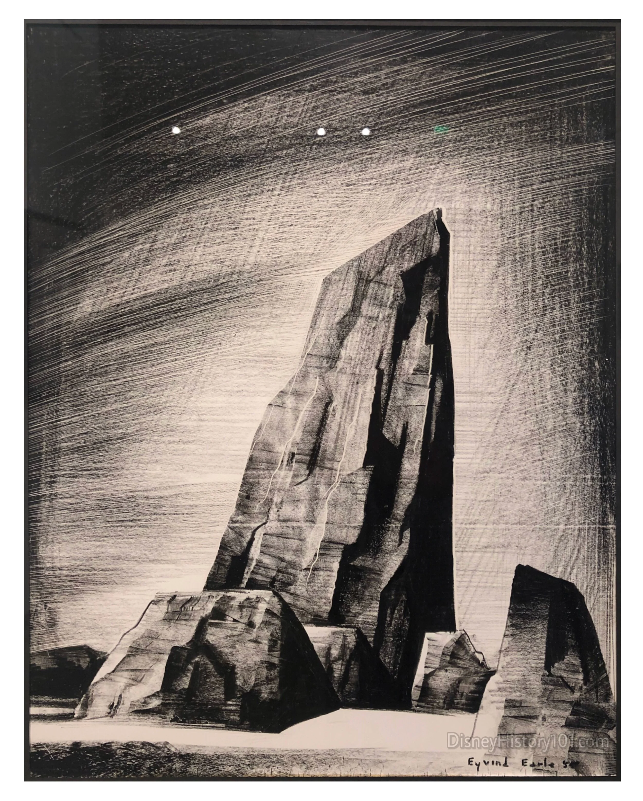 Eyvind's work profoundly enchants with his trademark clusters of patterned strokes and textures, overlaying bold colorful fields (which are generally illuminated or cast in shadow from beyond). After this brief tour with your Disney History 101 Field Guide Beth, please visit the exhibit (located only minutes from Disneyland in Anaheim), and explore Eyvind's settings as photographs can only limitedly capture their radiance and majesty.